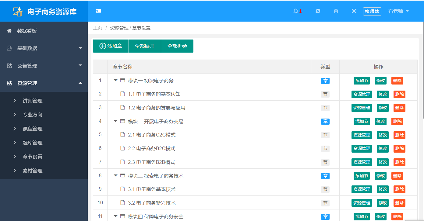 “電商(shang)資源(yuan)庫”按(an)照共建(jian)(jian)共享、邊建(jian)(jian)邊用的原則,依(yi)據企(qi)業(ye)電子商(shang)務(wu)相關(guan)崗(gang)位工作任(ren)務(wu)與項目及要求,參照電子商(shang)務(wu)專業(ye)教(jiao)(jiao)學(xue)(xue)標準和專業(ye)人才培(pei)養方案,電子商(shang)務(wu)專業(ye)著力(li)建(jian)(jian)設服(fu)務(wu)于(yu)學(xue)(xue)生自主學(xue)(xue)習、支(zhi)持教(jiao)(jiao)師課程教(jiao)(jiao)學(xue)(xue)與開發(fa)、引(yin)領專業(ye)建(jian)(jian)設、支(zhi)持企(qi)業(ye)崗(gang)位培(pei)訓(xun)、提升校企(qi)合作水平等多功能為一(yi)體的專業(ye)教(jiao)(jiao)學(xue)(xue)資源(yuan)庫。