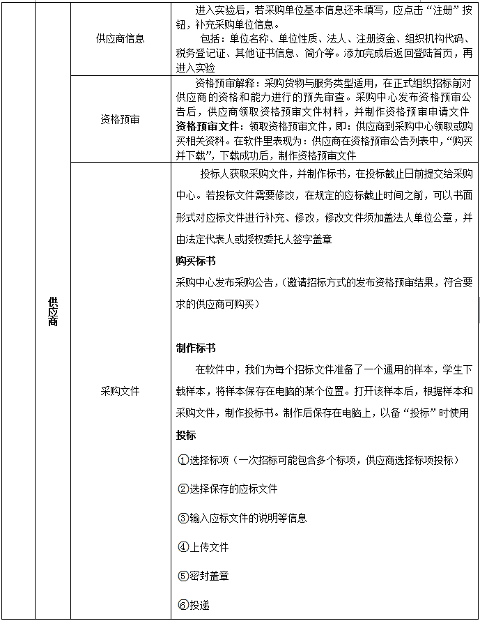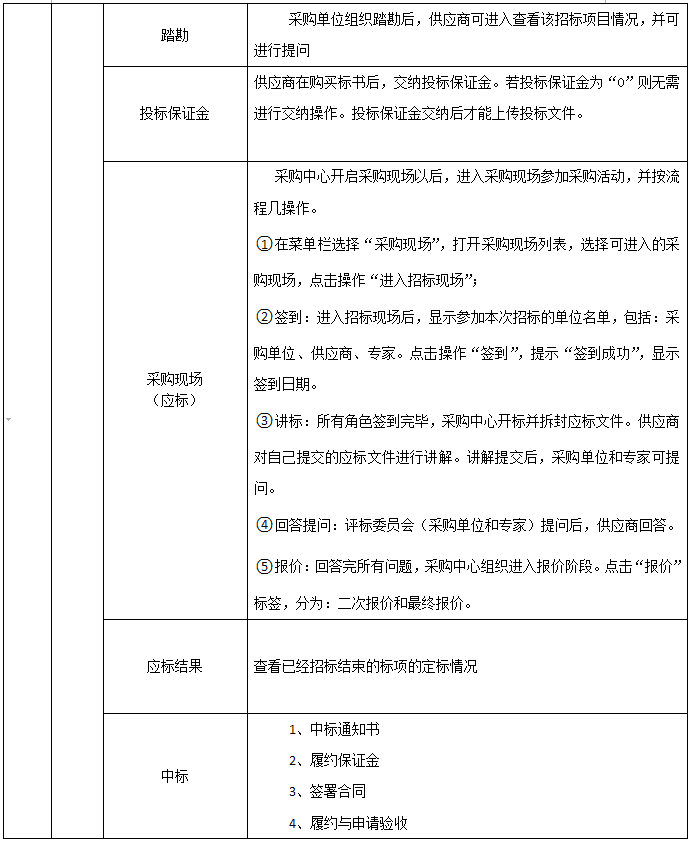 供應(ying)商信息、資格預審(shen)、采購(gou)文件、踏勘、投標(biao)保證(zheng)金、采購(gou)現場(應(ying)標(biao))、應(ying)標(biao)結果、中標(biao)、驗收、支付