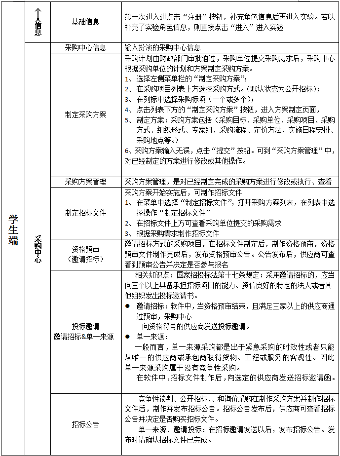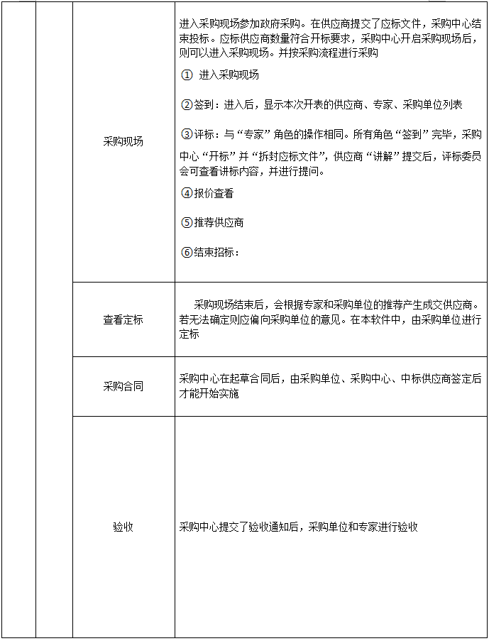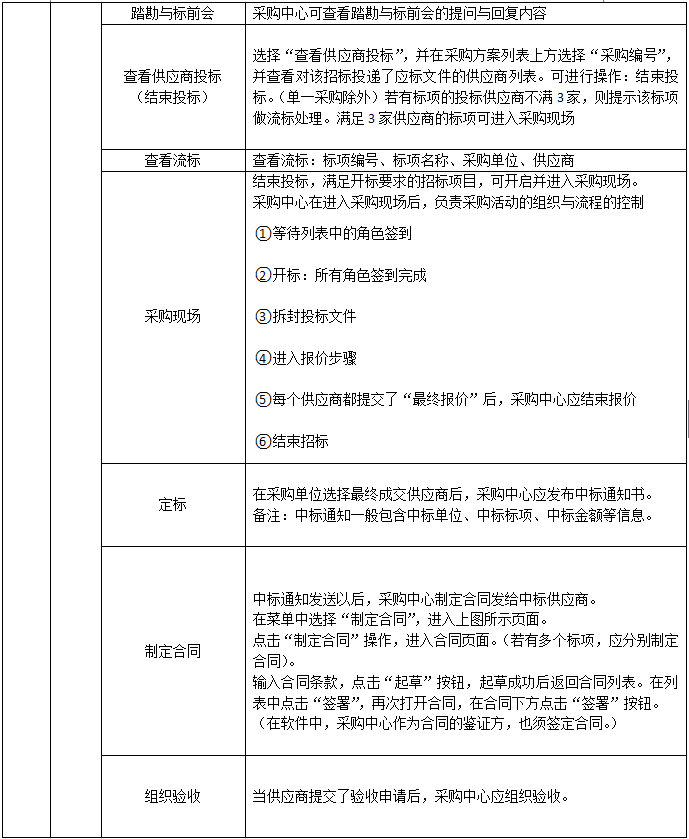 采購中心信息、制定采購方案、采購方案管理制定招標(biao)(biao)文件、資(zi)格預審(邀請招標(biao)(biao))、投(tou)(tou)(tou)標(biao)(biao)邀請、邀請招標(biao)(biao)&單一(yi)來源、招標(biao)(biao)公告、踏勘與標(biao)(biao)前會、查看供(gong)應商投(tou)(tou)(tou)標(biao)(biao)、(結束投(tou)(tou)(tou)標(biao)(biao))查看流標(biao)(biao)、采購現(xian)場、定標(biao)(biao)、制定合同、組織驗收
