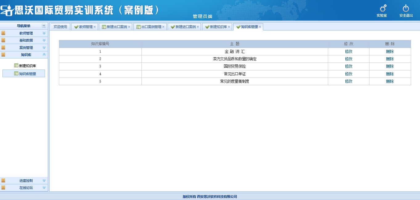 9.提供知識(shi)(shi)(shi)(shi)庫(ku),即“背(bei)景(jing)知識(shi)(shi)(shi)(shi)”,是由管理(li)(li)員在(zai)(zai)管理(li)(li)平臺的(de)(de)“管理(li)(li)員管理(li)(li)”下的(de)(de)“知識(shi)(shi)(shi)(shi)庫(ku)管理(li)(li)”中進(jin)行知識(shi)(shi)(shi)(shi)庫(ku)內容的(de)(de)添加和管理(li)(li)。如果要查看知識(shi)(shi)(shi)(shi)庫(ku)內容,可不(bu)需要登陸。在(zai)(zai)系統首頁(ye),點擊(ji)“出口流程”、“進(jin)口流程”或(huo)“咨詢信(xin)息”、“教師入口”等,都(dou)可打開知識(shi)(shi)(shi)(shi)庫(ku)的(de)(de)鏈節頁(ye)面。