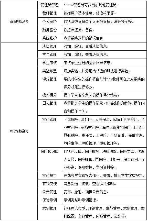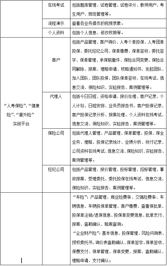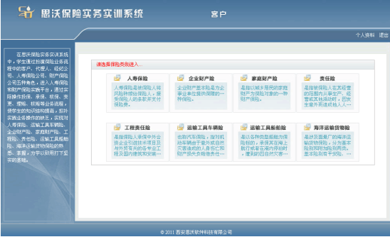 學(xue)生(sheng)通過(guo)飾(shi)演保(bao)(bao)(bao)險(xian)(xian)(xian)(xian)(xian)業(ye)務(wu)流(liu)程中(zhong)的(de)客戶、代理(li)人、經紀(ji)公(gong)(gong)司、人壽保(bao)(bao)(bao)險(xian)(xian)(xian)(xian)(xian)公(gong)(gong)司、財(cai)產保(bao)(bao)(bao)險(xian)(xian)(xian)(xian)(xian)公(gong)(gong)司五種角(jiao)色,進入“人壽保(bao)(bao)(bao)險(xian)(xian)(xian)(xian)(xian)”和“財(cai)產保(bao)(bao)(bao)險(xian)(xian)(xian)(xian)(xian)”實踐平臺,從展(zhan)業(ye)投(tou)保(bao)(bao)(bao)環節開始,至(zhi)索賠理(li)賠為(wei)止,全面操練保(bao)(bao)(bao)險(xian)(xian)(xian)(xian)(xian)核(he)心業(ye)務(wu)中(zhong)的(de)投(tou)保(bao)(bao)(bao)、承保(bao)(bao)(bao)、核(he)保(bao)(bao)(bao)、變更、理(li)賠、核(he)賠等(deng)流(liu)程,使學(xue)生(sheng)的(de)知識結構(gou)提升,彌補實踐業(ye)務(wu)操作的(de)缺乏,實現對(dui)(dui)人壽保(bao)(bao)(bao)險(xian)(xian)(xian)(xian)(xian)、運(yun)輸工(gong)具車輛險(xian)(xian)(xian)(xian)(xian)、企業(ye)財(cai)產險(xian)(xian)(xian)(xian)(xian)、家庭(ting)財(cai)產險(xian)(xian)(xian)(xian)(xian)、海(hai)洋運(yun)輸貨物(wu)保(bao)(bao)(bao)險(xian)(xian)(xian)(xian)(xian)、運(yun)輸工(gong)具船舶(bo)險(xian)(xian)(xian)(xian)(xian)、責任險(xian)(xian)(xian)(xian)(xian)、工(gong)程險(xian)(xian)(xian)(xian)(xian)的(de)熟悉、掌握,對(dui)(dui)保(bao)(bao)(bao)險(xian)(xian)(xian)(xian)(xian)業(ye)務(wu)的(de)主要工(gong)作流(liu)程有一(yi)個清晰的(de)輪廓(kuo),為(wei)學(xue)以(yi)致用(yong)打(da)下(xia)堅固的(de)基礎。
