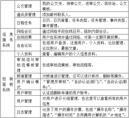 你(ni)可(ke)以(yi)向公(gong)共(gong)信息(xi)欄(lan)內發布新(xin)聞、通(tong)知……其(qi)(qi)他用戶可(ke)及(ji)時瀏覽最新(xin)信息(xi)。“我的(de)(de)辦(ban)(ban)公(gong)室”模(mo)塊(kuai),你(ni)可(ke)以(yi)輕松(song)管理(li)各類型文(wen)檔資料;郵件系(xi)(xi)統方便了與其(qi)(qi)他人(ren)員的(de)(de)聯系(xi)(xi);公(gong)文(wen)辦(ban)(ban)理(li)是辦(ban)(ban)公(gong)系(xi)(xi)統的(de)(de)重點,公(gong)文(wen)審批流程將在(zai)(zai)此進行(xing);通(tong)訊錄讓你(ni)輕松(song)查閱需要的(de)(de)聯系(xi)(xi)方式。“日志任務(wu)(wu)”模(mo)塊(kuai)是個人(ren)事務(wu)(wu)計劃和實施的(de)(de)小秘書,提(ti)醒(xing)你(ni)待辦(ban)(ban)公(gong)文(wen)和待辦(ban)(ban)事件。你(ni)可(ke)以(yi)在(zai)(zai)線(xian)與其(qi)(qi)他成員交流,或者進行(xing)網絡會(hui)議、在(zai)(zai)線(xian)投票(piao)及(ji)自由(you)討(tao)論(lun)。