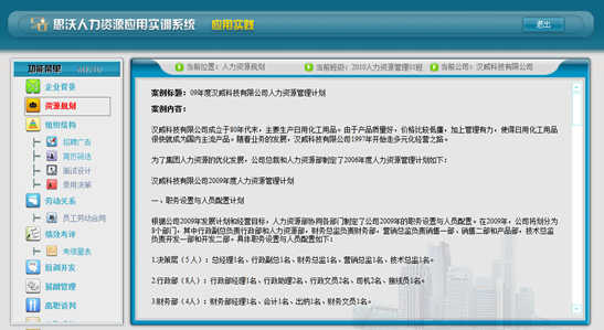 學生(sheng)端(duan)通過教(jiao)師(shi)提供(gong)的實踐應用案例,進(jin)行人(ren)(ren)力(li)資源規劃、組織結構管(guan)理(li)、勞動關系管(guan)理(li)和(he)績效考核、培(pei)訓(xun)發展等步驟(zou)的操作(zuo)。操作(zuo)流程明(ming)確,思(si)路清晰,學生(sheng)在輕(qing)松的操作(zuo)中(zhong),就能很快的體驗(yan)到人(ren)(ren)力(li)資源管(guan)理(li)的步驟(zou)和(he)流程,學習并(bing)實踐人(ren)(ren)力(li)資源管(guan)理(li)中(zhong)的技(ji)巧和(he)應變。