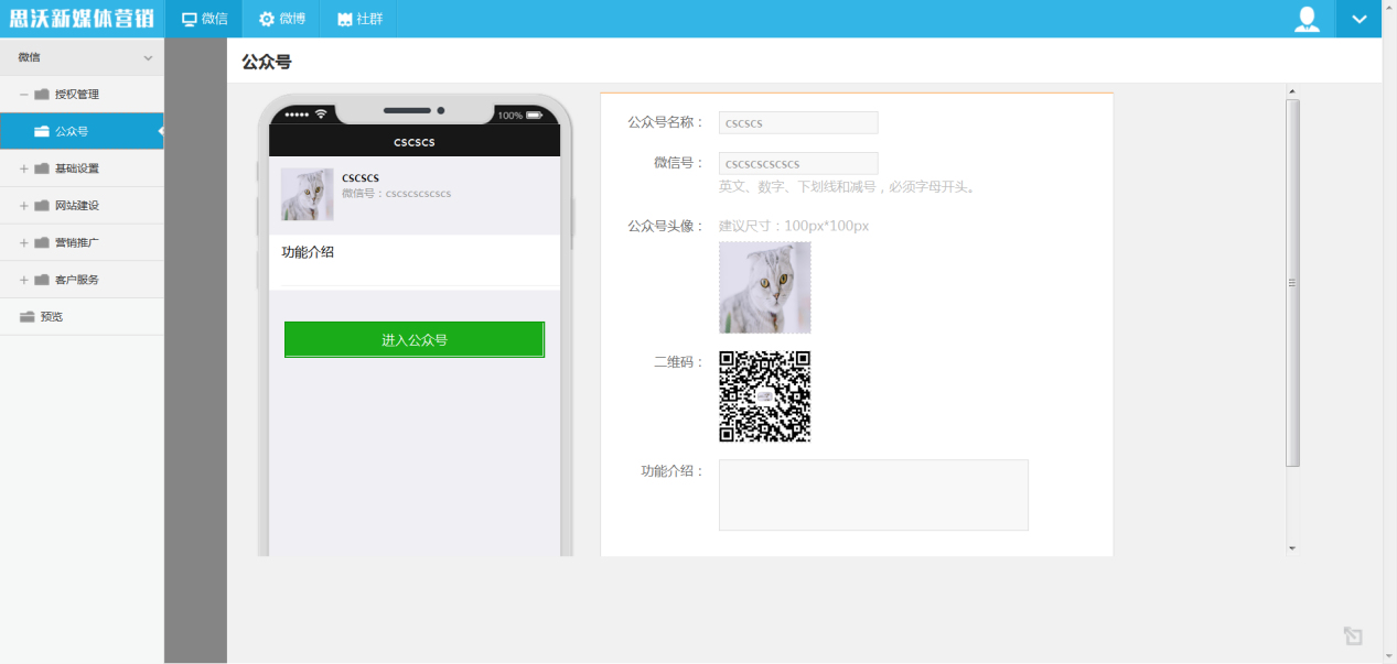 思沃新媒(mei)體營銷模擬實訓平(ping)臺系(xi)統模擬了真實的新媒(mei)體營銷環境,提供(gong)包括:微信(xin)(xin)營銷、微博營銷和社群營銷,用戶根(gen)據(ju)該教學(xue)軟(ruan)件(jian)系(xi)統提供(gong)的營銷模塊進(jin)行營銷操作(zuo),新媒(mei)體營銷主(zhu)要以微信(xin)(xin)公眾號,微博,社群這三種(zhong)營銷模式為(wei)主(zhu)進(jin)行實訓。