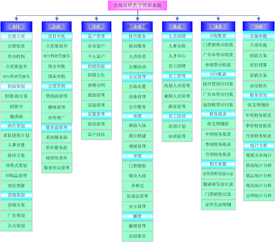思沃會(hui)展(zhan)(zhan)營銷模擬實(shi)(shi)訓(xun)系(xi)統(tong)以(yi)(yi)(yi)模擬會(hui)展(zhan)(zhan)公司的策劃部(bu)(bu)、外聯部(bu)(bu)、招商(shang)部(bu)(bu)、會(hui)展(zhan)(zhan)服(fu)務(wu)部(bu)(bu)、人事(shi)部(bu)(bu)、財務(wu)部(bu)(bu)以(yi)(yi)(yi)及(ji)總經辦7大(da)業務(wu)部(bu)(bu)門為基(ji)礎而展(zhan)(zhan)開(kai)實(shi)(shi)驗操作(zuo)的。該教學平(ping)臺軟件業務(wu)內容(rong)包(bao)括了:項(xiang)(xiang)目(mu)(mu)上報審(shen)批、項(xiang)(xiang)目(mu)(mu)的策劃安排、服(fu)務(wu)商(shang)管理(li)、人事(shi)招聘與(yu)(yu)管理(li)、會(hui)展(zhan)(zhan)的現場(chang)服(fu)務(wu)與(yu)(yu)合(he)同管理(li)等(deng)等(deng),讓(rang)學生通過(guo)實(shi)(shi)驗感受會(hui)展(zhan)(zhan)項(xiang)(xiang)目(mu)(mu)的系(xi)統(tong)化管理(li)流(liu)程與(yu)(yu)業務(wu)操作(zuo)內容(rong),不(bu)但(dan)能夠了解(jie)(jie)會(hui)展(zhan)(zhan)項(xiang)(xiang)目(mu)(mu)從立項(xiang)(xiang)審(shen)批到策劃、宣傳、招展(zhan)(zhan)招商(shang)、現場(chang)服(fu)務(wu)以(yi)(yi)(yi)及(ji)會(hui)后(hou)(hou)總結各(ge)個環節(jie)的業務(wu),同時還(huan)可以(yi)(yi)(yi)掌握(wo)(wo)各(ge)種文(wen)案(an)的寫作(zuo)技(ji)巧,從而讓(rang)學生真正的理(li)解(jie)(jie)并掌握(wo)(wo)會(hui)展(zhan)(zhan)這(zhe)一(yi)行(xing)業的各(ge)種知識與(yu)(yu)業務(wu)要求。為學生以(yi)(yi)(yi)后(hou)(hou)的工作(zuo)、學習提供了一(yi)個實(shi)(shi)戰演練的實(shi)(shi)訓(xun)平(ping)臺,增強(qiang)了學生進入工作(zuo)崗(gang)位后(hou)(hou)的實(shi)(shi)力。